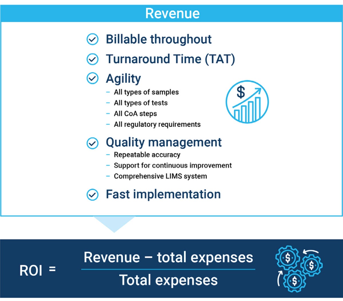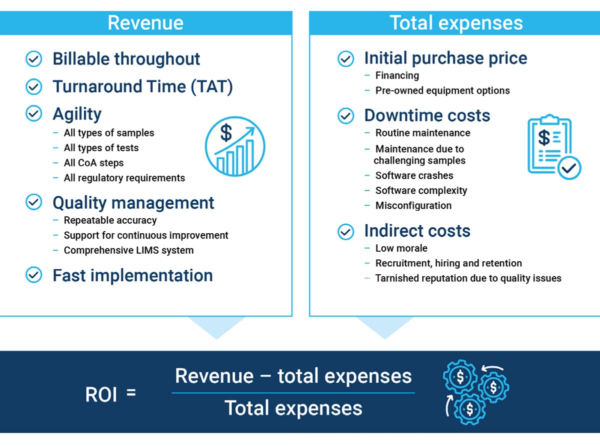 For example, the right equipment can foster repeatable accuracy and precision in results, leading to a reputation for quality which is likely to result in a larger customer base. In addition, a vendor's ability to improve every aspect of quality management that impacts ROI—from a focus on TAT, to method development, to excellent staff training, to reagent preparation—is critical. Simply put, by not compromising on these principles, laboratories can minimize the risk of errors, strengthen their position in the industry, elevate their reputation among potential customers, and maximize ROI.