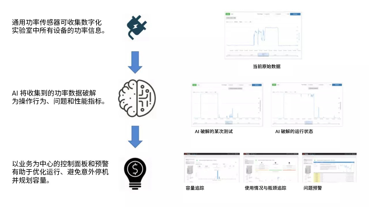 将 AI 与通用监测功能结合用于检测和监控一系列变量(例如仪器的功耗),使公司能够为其业务实现一定的运营和财政收益并制定未来计划。通过高质量且可轻松获得的见解,AI 可以同步监测实验室中所有设备的使用情况并进行整体容量追踪。