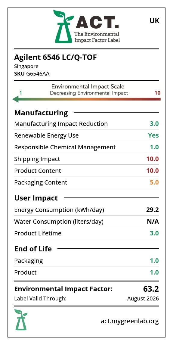 The Singapore facility that manufactures the Agilent 6546 LC/Q-TOF system has implemented a robust EHS program, including ISO 14001 certification. Additionally, the Agilent 6546 LC/Q-TOF system is EU RoHS compliant and does not utilize any chemicals of concern.