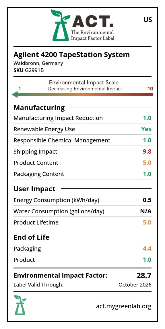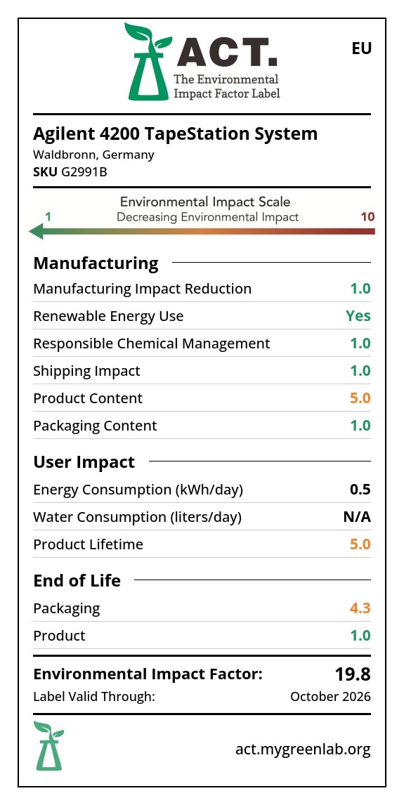 The Waldbronn, Germany facility that manufactures the Agilent TapeStation System is ISO 14001 certified. Additionally, the Agilent TapeStation System is RoHS-compliant and does not contain chemicals of concern such as ILFI Red List Chemicals, EU REACH SVHC, or GreenScreen BM-1 chemicals.
