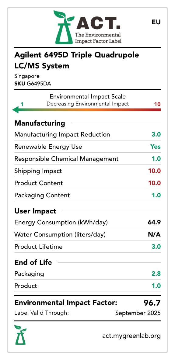 The new 6495D LC/TQ combines performance with intelligence and sustainability-driven innovations. The next evolution of our ultrahigh performance LC/TQ provides ultimate sensitivity with robustness and precision for trace level-analysis, while enabling smarter purchasing decisions based on the product’s environmental impact. The ACT certification, the world’s premier eco-label for laboratory products from My Green Lab, ensures accountability, consistency, and transparency. The My Green Lab environmental impact score is based on manufacturing practices, energy and water use, packaging, and end-of-life disposal, enabling sustainable lab procurement.