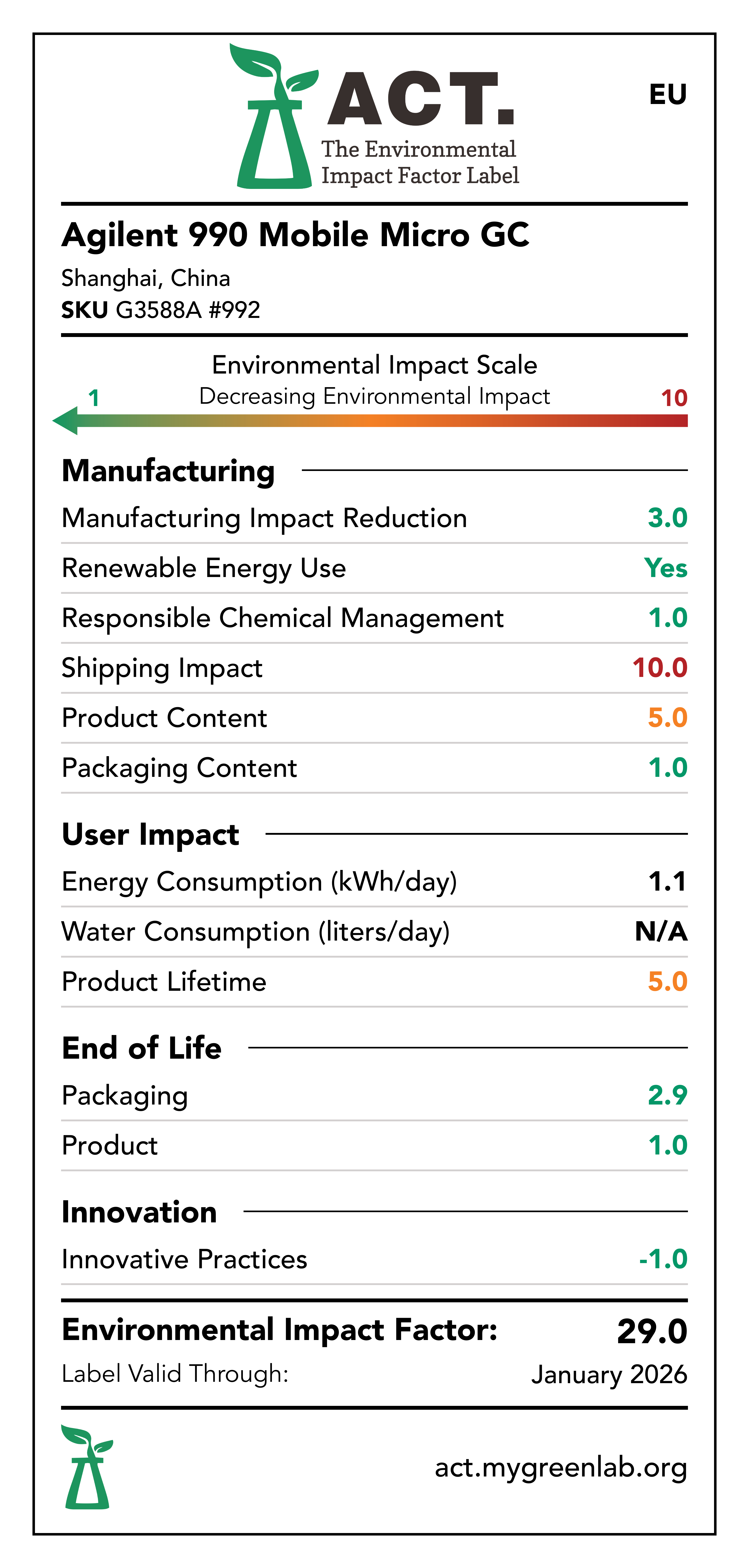 The Shanghai, China facility that manufactures Agilent 990 Micro GC Systems for the US, EU, and UK markets has implemented initiatives to reduce its energy and water consumption within the last 5 years. These initiatives include vacuum capacity improvement projects, implementing off-peak demand reduction initiatives, and installing RO and DI water treatment systems at the facility to reuse water on-site.