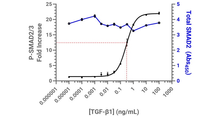 The Enzyme-Linked Immunosorbent Assay (ELISA) is a mainstay of many research labs that, when carried out carefully, provides powerful insight to biological processes. The assay is so well-established these days that ready-to-use kits are available that efficiently streamline experimental workflows. To quantitatively evaluate TGF-β signaling using SMAD2/3 phosphorylation as a readout, two ELISA kits were used: one that only detects phosphorylated SMAD2/3, and the other that detects total SMAD2/3. Measuring only phosphorylated SMAD2/3 can provide relative insight when comparing samples treated with various TGF-β concentrations, however by quantifying both phosphorylated and total SMAD2/3, those values can be further normalized via total protein load. The total SMAD2/3 values provide context as to the breadth of the stimulus response, which is insightful when comparing canonical and non-canonical signaling pathways.