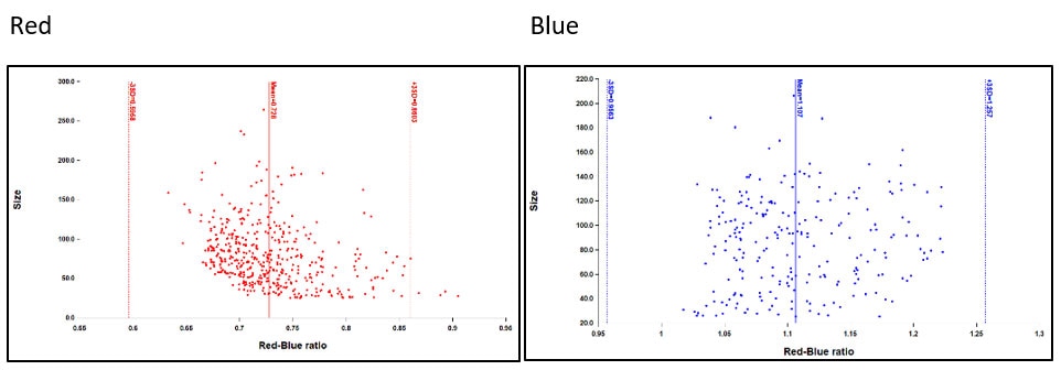 Figure 2. The population mean plus 2-3 standard deviations of a red-only well can be used to define the upper threshold of the ratio for red spots. Likewise, the population mean minus 2-3 standard deviations can be used to define the lower limit of blue spots. Spots with ratio values in between red and blue would be considered a mix of the two colors.