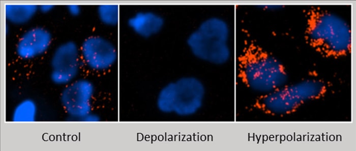 Both low and high potential mitochondria will accumulate MITO-ID fluorescent dye however the photophysical properties of this reagent cause an emission shift and red fluorescence is only readily detectable in hyperpolarized conditions. Images of Hela cells were captured using a BioTek automated imaging instrument after the addition of MITO-ID and a nuclear stain (blue). Visible in this panel are control, depolarized and hyperpolarized mitochondria of Hela cells.