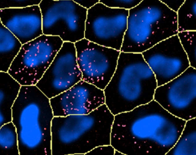 After imaging in two channels and background subtraction, primary masks should be applied to identify all cells in the field of view utilizing the nuclear stain (blue). Secondary masking can then be applied using the red channel.