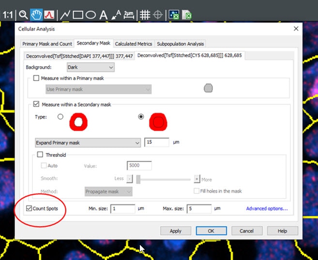 Within the Cellular Analysis window, the spot counting module can be utilized to identify punctae indicative of depolarized mitochondria. This will allow for identification of metrics such as “spots” or MMP positive aggregates per cell.