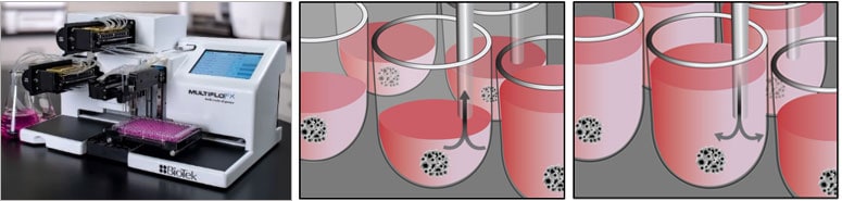 Displayed above is the the MultiFlo FX AMX module and schematics of media removal and addition using autoclavable peristaltic pump cassettes with eight stainless steel tube aspirate and dispense heads.