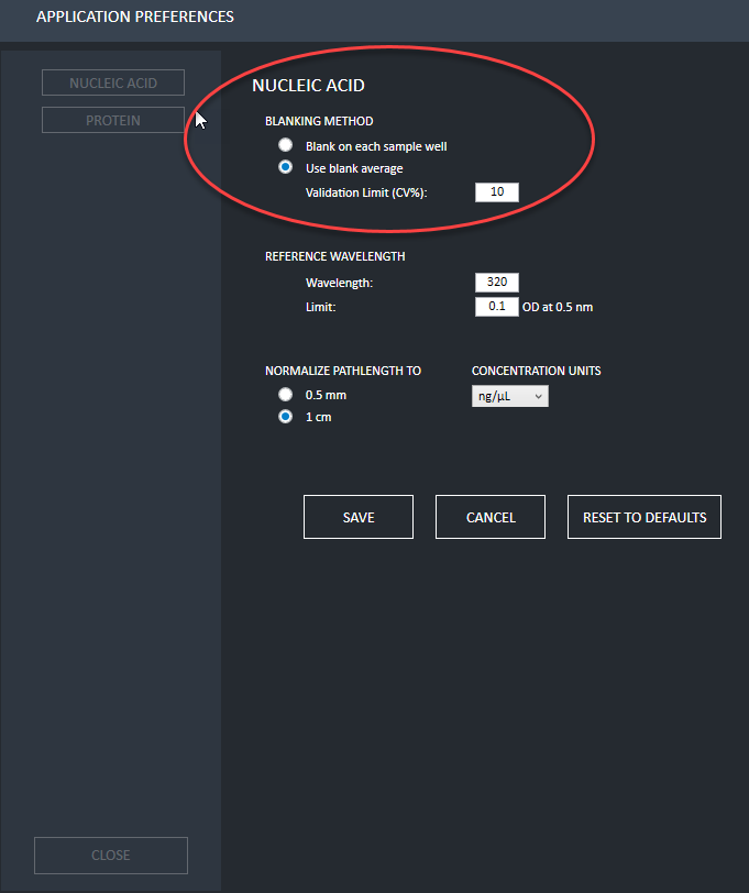 The application preferences have a number of blanking, reference wavelength selection and pathlength correction options.