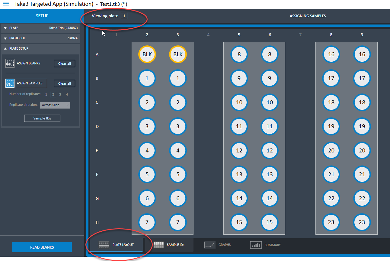 Samples are assigned using the plate layout tab, located at the bottom of the screen, after blanks are read if blanking on all wells. There are now four plates available for viewing at the top of the screen when the plate layout tab is selected. The first plate will be all positions with blanks.