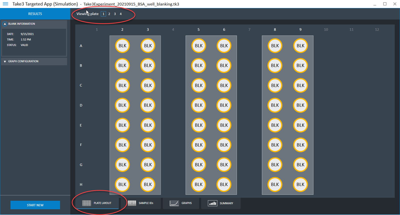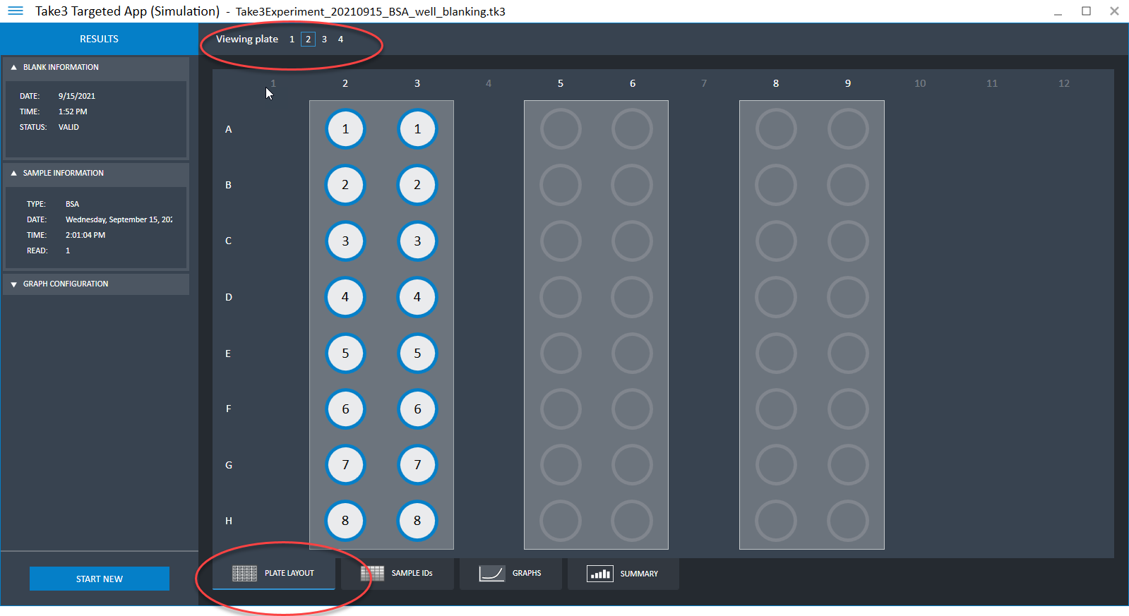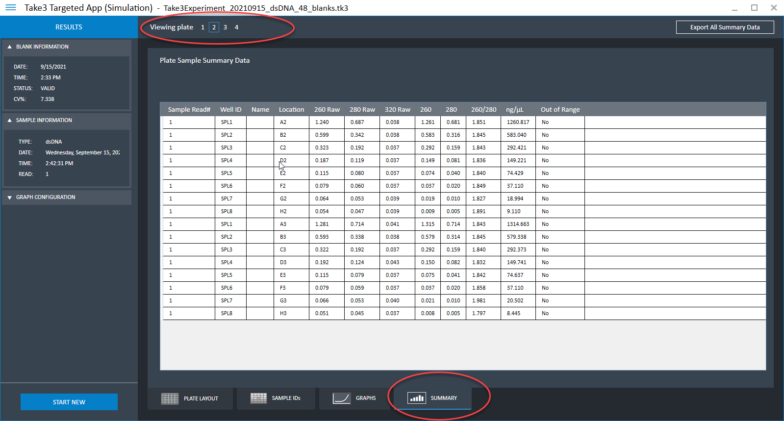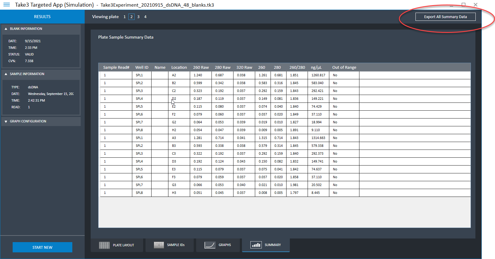 Plate 1 will have no sample data and will present the following message "No samples on this plate." Additional plates can be added once the read is complete and added to the plate count at the top of the screen. When measurements are completed, all data, including well blanking data, can be easily exported to a tab delimited text file using the Export All Summary Data button in the upper right corner of the window.