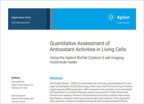 Anti Oxidant Power 1 (AOP1), an antioxidant live cell assay, was developed from the Light-Up Cell System (LUCS) technology, which allows for fine monitoring of reactive oxygen species (ROS) production.