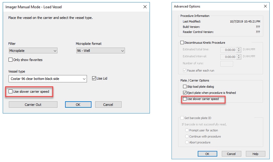 1. Slow the Carrier Speed: New in Gen5 3.08 is the ability to slow the speed with which the carrier enters the imager. This option is available in both Manual Mode and Experiment Mode, and is particularly recommended when imaging suspension or spheroid-based cultures during extended kinetics utilizing the BioSpa 8 Automated Incubator.