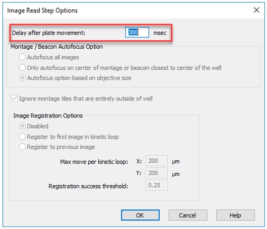 2. Add a Delay After Plate Movement: By default, Gen5 builds in a 300ms delay between carrier movement and image capture. This value can be reduced for faster acquisition OR increased to allow suspension cultures or spheroids to resettle after movement.