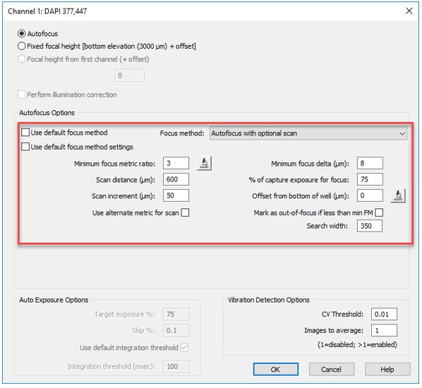 3. Optimize the Autofocus Method: Even for spheroid and suspension cultures, the laser autofocus provides superior speed and performance; however the unique conditions inherent in these cultures sometimes require further optimization. By de-selecting the Default focus method and settings, you gain additional freedom in defining parameters such as the scan distance and increment, or utilizing alternative methods, such as user-trained autofocus. Read more about Autofocus Methods in the Imaging Training Guide that was included with your BioTek Lionheart FX Automated Microscope or Cytation Cell Imaging Multi-Mode Reader.