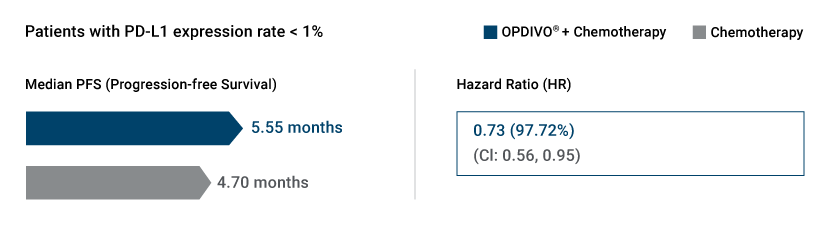 CHECKMATE-227, Part 1b highlighted the median Progression free survival and hazard ratio outcomes from combining OPDIVO® (nivolumab) plus Chemotherapy as a first line treatment for metastatic NSCLC patients whose tumors exhibited PD-L1 expression <1%.