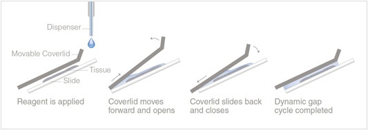 The Dynamic Gap technology uses capillary force during reagent application, while switching to continuous movement of reagents during reagent incubation and washes. This process increases the consistency of staining and prevents common staining artifacts such as patchy staining, edge effects and air bubbles.