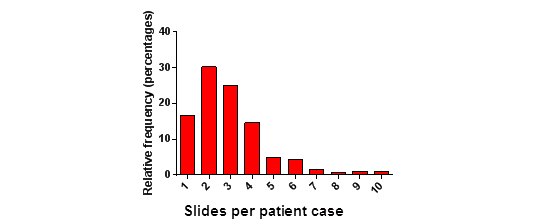 N=301, Median 3, 90% percentile five slides per patient case. Average 2.97 slide pr patient case. Range 1-10 slides per patient case. Source: Routine clinical data, University of Rochester Medical Center, USA