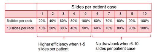Five slide racks increase efficiency when loading patient cases through reduction of empty slots
