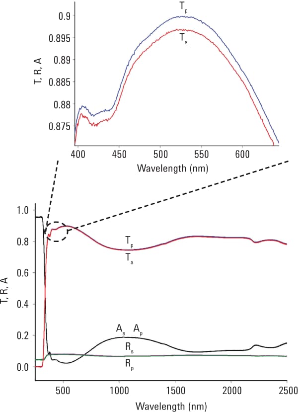 The examples shown in Figure 1 and Figure 2 demonstrate the high-quality data that leads to accurate characterization of these types of samples. For the spectra in Figure 2, we collected both s- and p-polarized spectral data at 7° angle of incidence. The inset provides a closer look at the transmission spectra in Figure 2 and reveals an expected separation of approximately 0.003 between s- and p-polarized spectra.