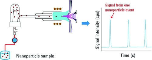 In 2004, Degueldre, Favarger and Bitea [1] characterized NPs based on elemental determination using an Agilent 4500 ICP-MS. They discovered that if you introduce samples containing NPs at a low flow rate and the number of particles in the solution is also sufficiently low, analysis using ICP-MS in time-resolved mode makes it possible to collect the signal generated as each individual particle is vaporized in the plasma. Then, each measured data point can be correlated to a size and a mass fraction for a unique NP. This method of NP characterization is called Single Particle ICP-MS analysis (SP-ICP-MS). The key feature of this analysis lies in the capacity of the ICP-MS to collect the data for a single NP. For this reason, care must be applied to the dilution factor and the selection of the integration time, to ensure that the individual particles’ signals can be distinguished.