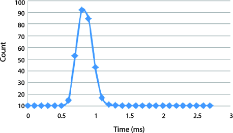 Figure 1 shows the typical pattern of intensities measured by the Agilent 7700x ICP-MS in single particle (TRA) mode for one of the gold NP standards (NIST 8012). From the raw data, the signals due to the background values are eliminated, and the remaining intensities are converted into particle sizes to give a size distribution pattern.