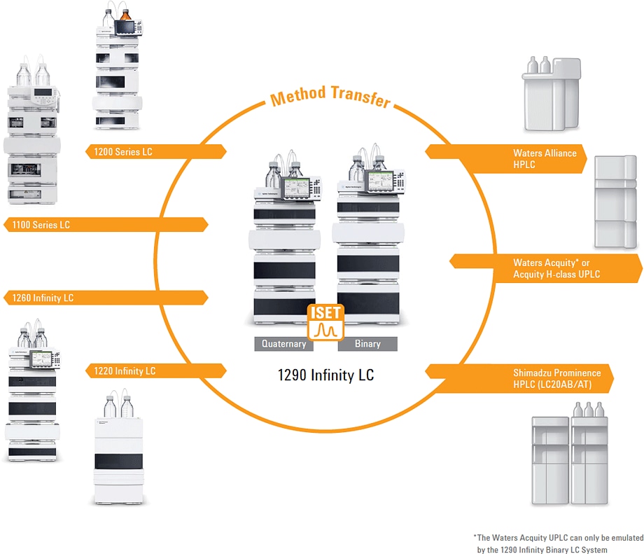 The Agilent 1290 Infinity LC with ISET simplifies method transfer because it enables you to emulate another HPLC or UHPLC system with a single mouse click.