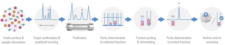 Crude samples are often analyzed on UHPLC/Mass Spectometry systems.Target compounds are automatically identified and tailored gradient profiles for the purification step are generated to obtain an optimum resolution and process efficiency. After the purification step, the purity of the collected fractions is determined directly by spectral data information. Pure fractions of the same compound will be pooled, dried down, and resubmitted to UHPLC/MS for purity confirmation before archiving or submitting them to screening tests. The software tracks the submitted samples and the identity of the collected fractions through the entire purification process.