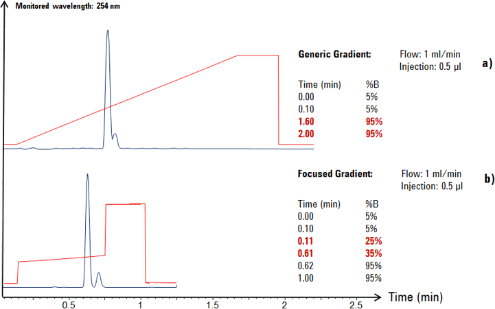 In this example, a generic gradient was applied for the analytical scouting run of the crude product on UHPLC columns. By using a generic gradient profile, the resolution was not yet optimized for this sample (see Figure 2a).