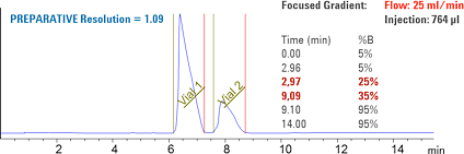 After a focused gradient profile (modified gradient profile) had been developed by a chromatographer, the target compound showed successful separation from its byproduct (Figure 2b). The focused gradient profile was transferred to the larger preparative column dimensions using established mathematical equations [1,2].