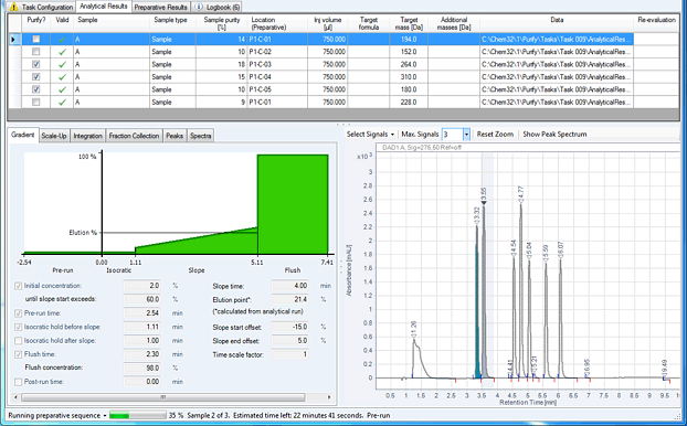 Tailored gradient profiles and spectral data can be reviewed by the use of the analytical result browser (Figure 4). The gradient profiles and identified targets can also be modified by the operator. After the purification step has been completed, all relevant information from the collected fractions can be reviewed by the use of the fractions result browser. A tracking file from the injected sample to the collected fraction is created in *.CSV format for further use.