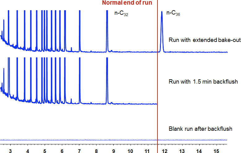 Figure 2 shows a GC/MS method with post-column backflushing. In this example, n-C36 alkane elutes after the normal end of the run (11.6 min), as seen in the top chromatogram. The middle chromatogram shows the same sample, but the run is stopped and backflushed for 1.5 minutes at the final oven temperature. The bottom chromatogram is a blank run immediately after the backflush run. It shows that the n-C36 peak was completely removed by the backflushing process.