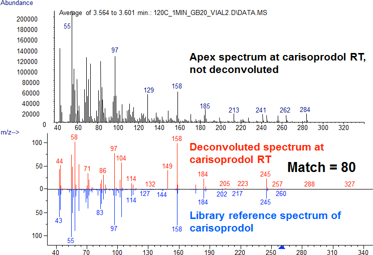 Figure 3 (top) shows the apex spectrum at the RT of carisoprodol in a blood extract before deconvolution. When searched against the NIST library, the top hit was oleic acid and carisoprodol did not appear in the top 100 hits. The bottom of Figure 3 shows the deconvoluted spectrum. Now with the interferences removed by AMDIS, the spectrum matches carisoprodol in the NIST library with a match quality of 80 and is the top hit.