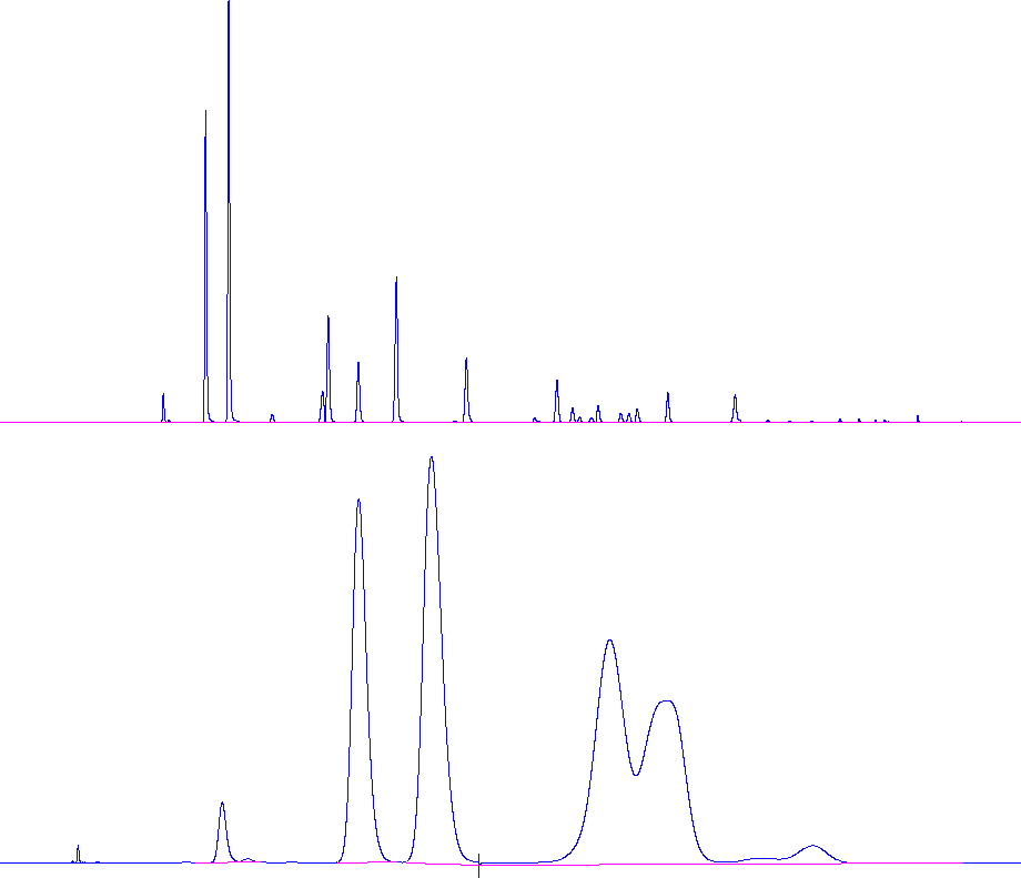 Figure 1. Example of a typical Y-grade sample chromatogram; hydrocarbons (above) and permanent gases (below).
