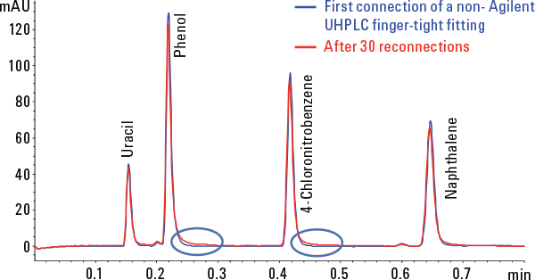 We repeated the experiment using a reusable finger-tight UHPLC fitting with a polymeric ferrule from another vendor. After only 30 reconnections, the polymeric ferrule locked onto the capillary and could not be adjusted, resulting in dead volume. Comparing the chromatograms demonstrated the effects of dead volume, as shown in Figure 3. You can see deterioration of peak shape, including larger peak tailing and lower peak height.