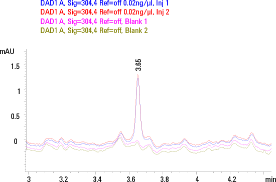 This method was shown to be linear across the dynamic range of 0.02-100 ng/µL for MTX and 0.1-100 ng/µL for SSZ. The LOD and LLOQ for MTX were 0.01 and 0.02 ng/µL with S/N values of 6 and 10 respectively. While for SSZ the LOD and LLOQ were 0.05 and 0.1 ng/µL with S/N values of 8 and 18 respectively. Figure 3 shows the typical chromatogram for MTX at LLOQ overlaid with blank traces in replicates. The chromatographic reproducibility at LLOQ was verified by replicate injections. The %CV of AUC and retention time at LLOQ were 0.02% and 1.46% respectively for MTX, and 0.01% and 0.79% respectively for SSZ 0.79% respectively for SSZ.