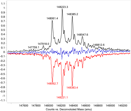 In this example, the originator and biosimilar were analyzed by LC/Q-TOF. Protein molecular weights were accurately confirmed and the major glycoforms identified. The deconvoluted mass spectra were mirror plotted for easy comparison. The black trace is Herceptin (trastuzumab) and the red trace is the biosimilar. The blue trace is the difference between the two samples. The nearly flat blue line shows that the two samples have great similarity at the intact level.