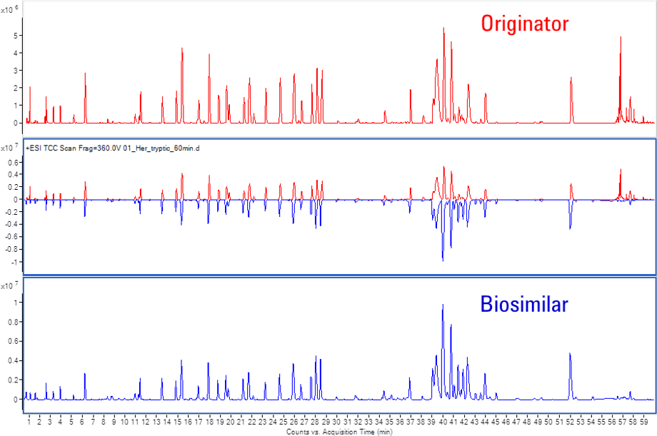 Mirror plot of Herceptin and biosimilar tryptic peptide mapping chromatograms.