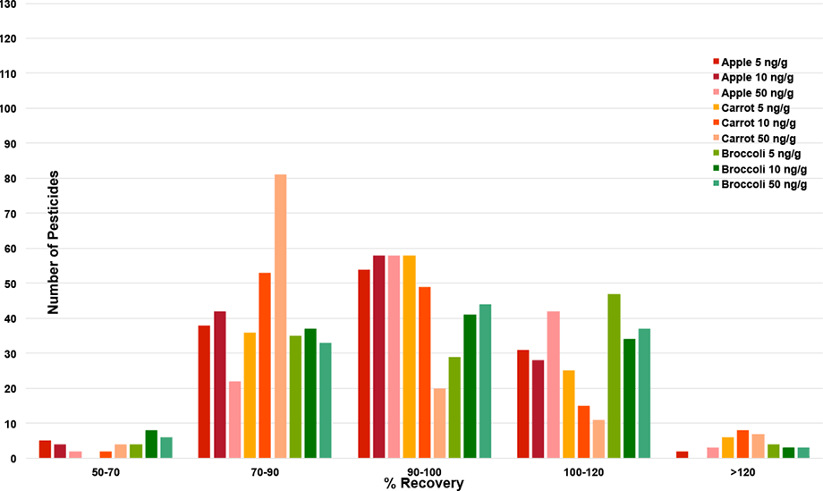 Figure 3. Distribution of recovery for 126 pesticides from pre-extraction spiked apples, carrots, and broccoli using 0.5 µL injection of 5, 10, and 50 ng/g level extracts.
