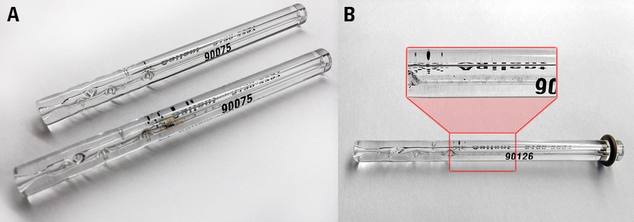 In Figure 4 we show GC inlet liners that have had different sample volumes injected. In A, the upper liner had over 65 injections of 0.5 µL sample. The lower liner had a greater amount of the same sample injected, 2.0 µL, also over 65 times and clearly contains increased deposits that reduce usable liner lifetime and added additional maintenance costs. The liner in B had reduced sample volume injected but over 200 injections (0.5 µL). This liner is almost free of visible deposits, shown clearly within the magnified view, which prolongs performance and decreases costs.