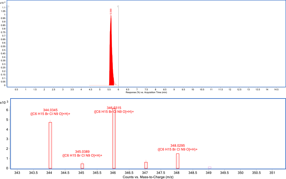 Figure 3. C6H15BrClN9O in crude oil. Note the spectral presence of bromine and chlorine.