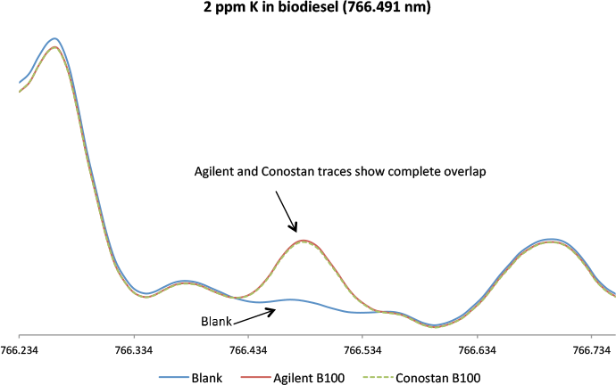 Figure 3. Comparison of Agilent and Conostan Biodiesel B100 standards for potassium at 2 ppm (766.491 nm) shows nearly identical traces.