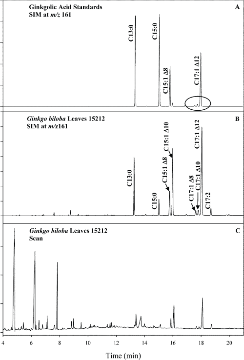 Recapping, Figure 2 shows selected ion chromatograms at m/z 161 for a mixture of four ginkgolic acid standards (A) and the plant sample 15212 (ginkgo leaves) (B), and the total ion chromatogram for this sample (C). The component pairs – C13:0/C15:1 and C15:0/C17:1 – that were difficult to resolve by HPLC were clearly resolved with this technique.