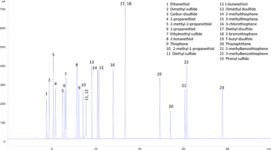 Figure 1. This chromatogram shows 23 unique sulfur compounds at 1 ppm on-column.