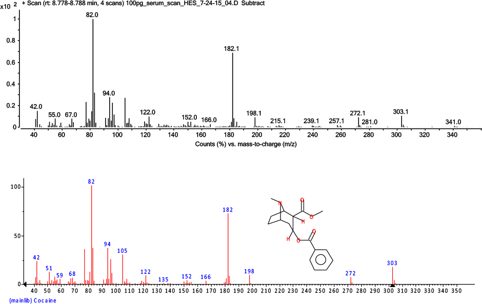 Figure 1 shows the mass spectrum of 100 pg cocaine spiked in serum (top) compared with the NIST spectrum (bottom). Cocaine is the first hit in NIST; the Match Factor is 810 (“good”) and is differentiated from pseudococaine, which has a Match Factor of 788 (“fair”). The equivalent concentration is 5 ng/mL, based upon complete recovery. The NIST library search provides excellent matches for cocaine as a first hit at concentrations above this level.