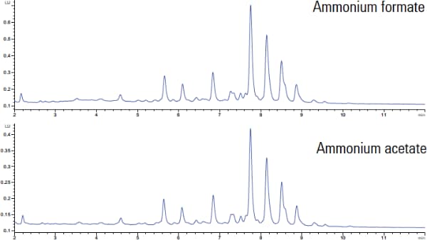 Answer: In glycan analysis, it is important to control the pH and so a buffer is always used. This does limit the options for MS compatibility to formate or acetate for the pH required. Glycans, such as those found in bovine fetuin, can be eluted with either ammonium formate or ammonium acetate mobile phases, as shown in Figure 3.