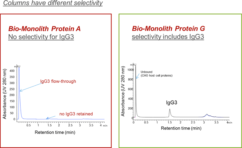 Figure 1. Comparison of selectivity of Agilent Bio-Monolith Protein A and G columns for the capture of IgG3.