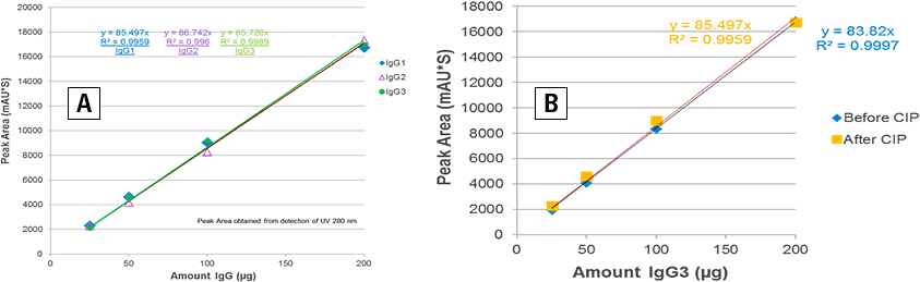 Figure 2. A, peak area linearity; B, before and after clean-in-place, column restores its full capacity and performance.