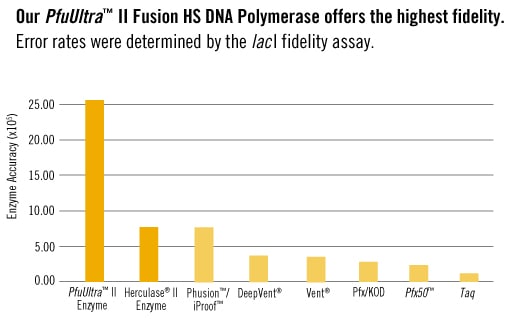 Our PfuUltra II Fusion HS DNA polymerase is the industry standard for ultra-high fidelity PCR. Our published and peer reviewed data demonstrates that the PfuUltra II Fusion HS DNA polymerase exhibits an accuracy 3-fold higher than any other high fidelity enzyme, including Phusion and iProof DNA polymerases, and 20-fold higher than Taq DNA polymerase, making it the most accurate enzyme available.