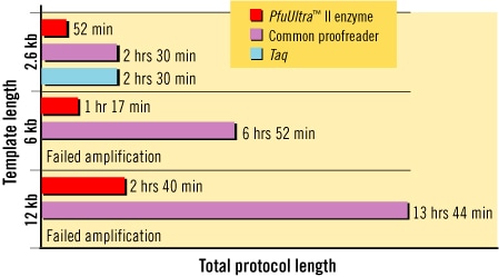 The PfuUltra II Fusion HS DNA Polymerase amplifies the widest variety of template sizes compared to other proofreading DNA polymerases. Because it requires short cycling times, genomic templates up to 19 kb in length can be amplified in a fraction of the time. In contrast, other commercial fusions exhibit limited target-length capability. Faster cycling provides you with quicker time-to results, higher throughput, and improves template integrity by minimizing exposure to extreme PCR temperatures.